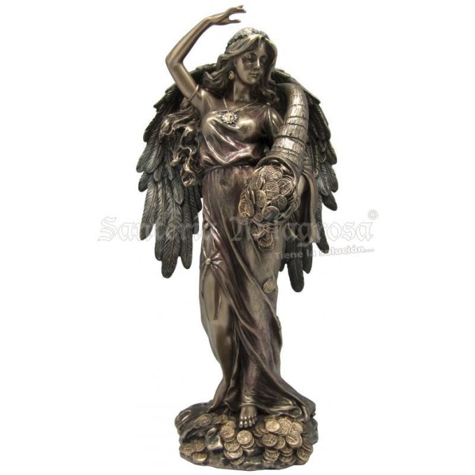 En esta imagen de Resina de 30 cms acabada en Dorajo Viejo se la representa con la cornucopia posada sobre un fondo de monedas.