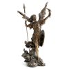 En esta imágen de resina de 35 cms acabada en dorado viejo se le representa vestido con armadura y un arco envuelto en llamas.