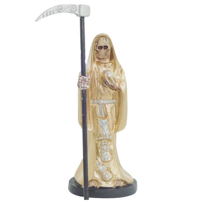 Santa Muerte 15 cm Dorada c/ Amuleto Semillas – Resina