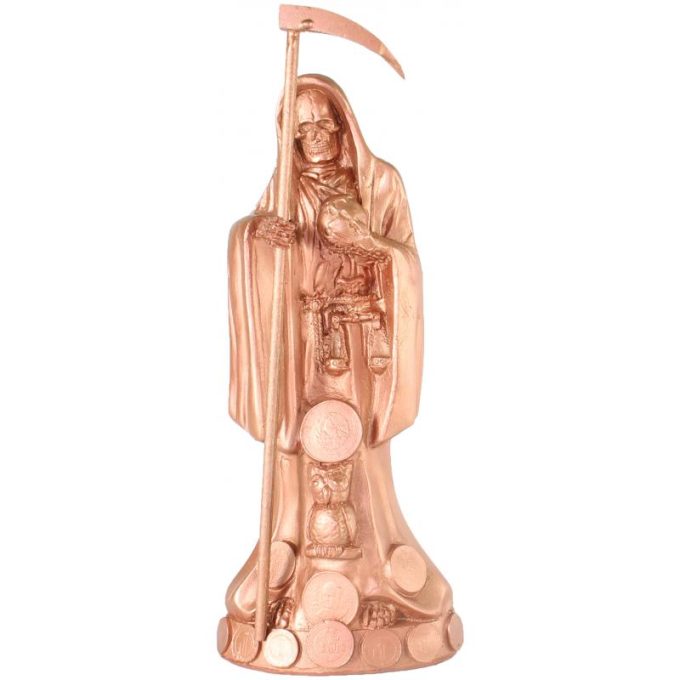 Imagen Santa Muerte C/ Monedas 30 cm. (Cobre) (c/ Amuleto Base)Artesanal Puede Variar el color y forma de los detalles- Resina(has)