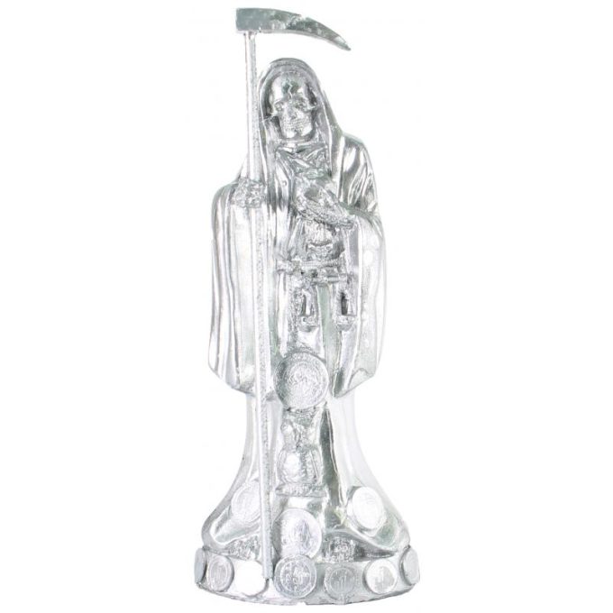 Imagen Santa Muerte C/ Monedas 30 cm. (Plateada) (c/ Amuleto Base)Artesanal Puede Variar el color y forma de los detalles- Resina(has)