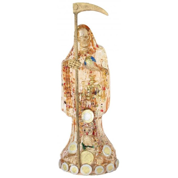 Imagen Santa Muerte C/ Monedas 30 cm. (Transparente Rosa) (c/ Amuleto Base)Artesanal Puede Variar el color y forma de los detalles- Resina(has)