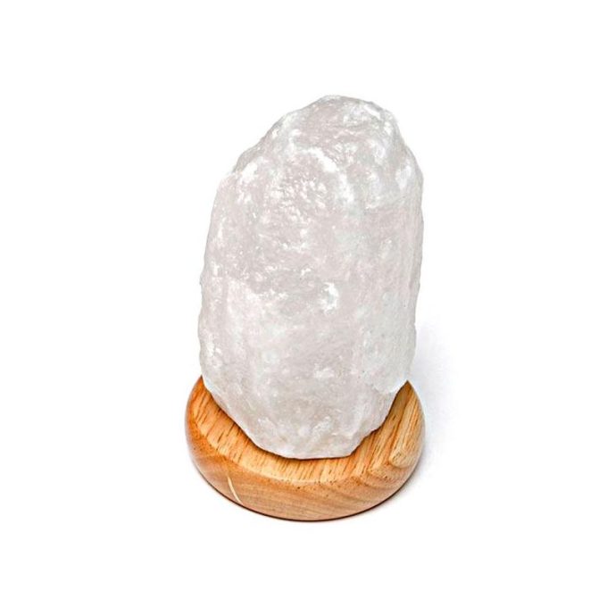 Lámpara led de sal del Himalaya blanca con conexión usb para cualquier pc. Con base de madera natural. Cambiando en siete tonos diferentes el color aleatoriamente