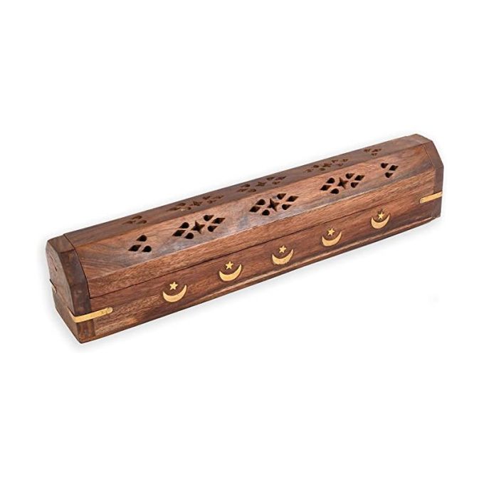 Porta Incienso Baul Madera c- Motivos Dorados Lunas y Estrellas