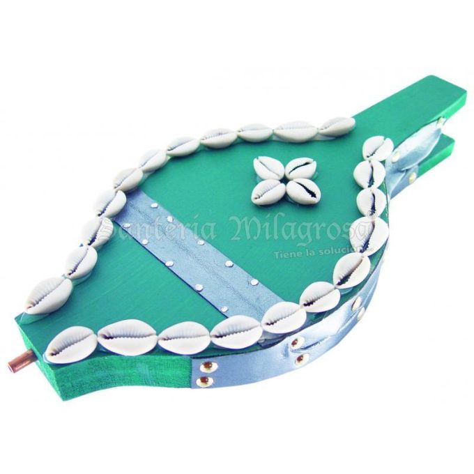 Fuelle decorado con Cauries (Caracol) de17x9,5cm aprox, esta es la herramienta que se emplea para avivar el fuego de una fragua. Como artículo religioso ayuda al Orisha que la posee en su fundamento, esta se le dedica al Orisha Oggún por su relación con la fragua la herrería y por las funciones que cumple este Orisha en la vida de la persona.